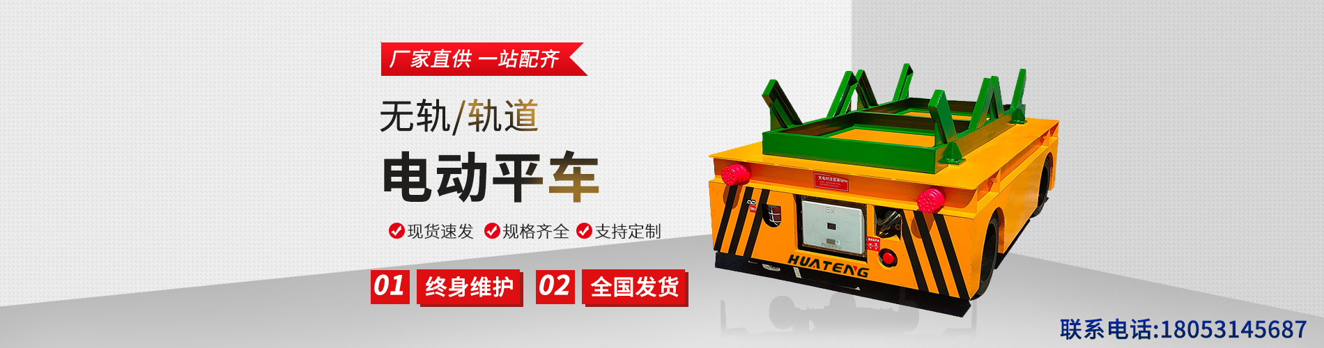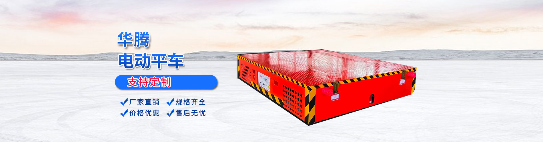 华腾电动平车是生产液压升降平台、汽车旋转展台、轨道电动平车、无轨电动平车、翻转机、载式绿篱修剪机、登桥、平板拖车、换轨转盘等多种机械产品的厂家。公司创立以来,不断追求技术进步,致力于产品创新;工艺先进合理、检测设备齐全,具有较高的现代化管理水平及较强的设计、生产能力。公司占地30000平米,拥有现代化生产车间20000平米,各种先进生产设备120余套,员工86人,其中技术人员12人,驻外安装售后人员31人。详情介绍>>