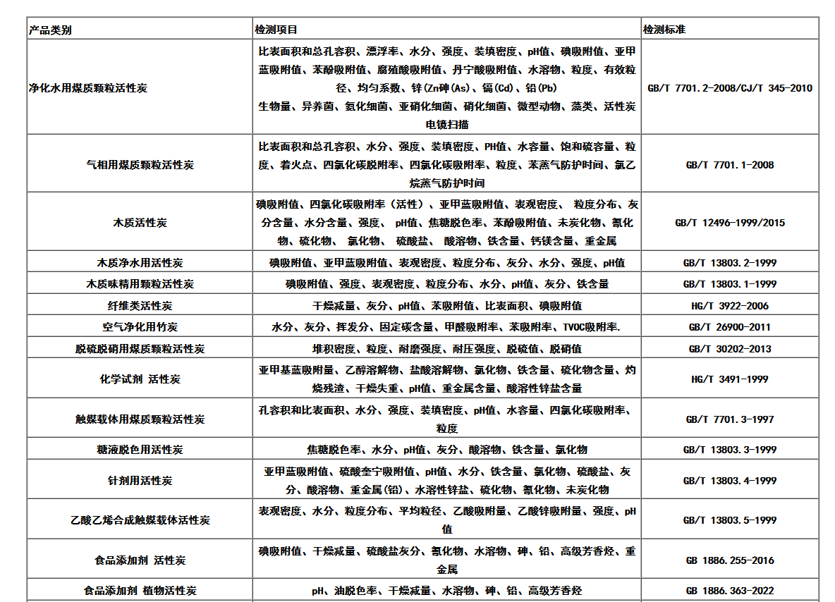 化学指标检测:碘吸附值,亚甲蓝吸附值,酚值,焦糖脱色率,糖蜜值,腐殖酸,丹宁酸吸附值,苯酚吸附值,比表面积等