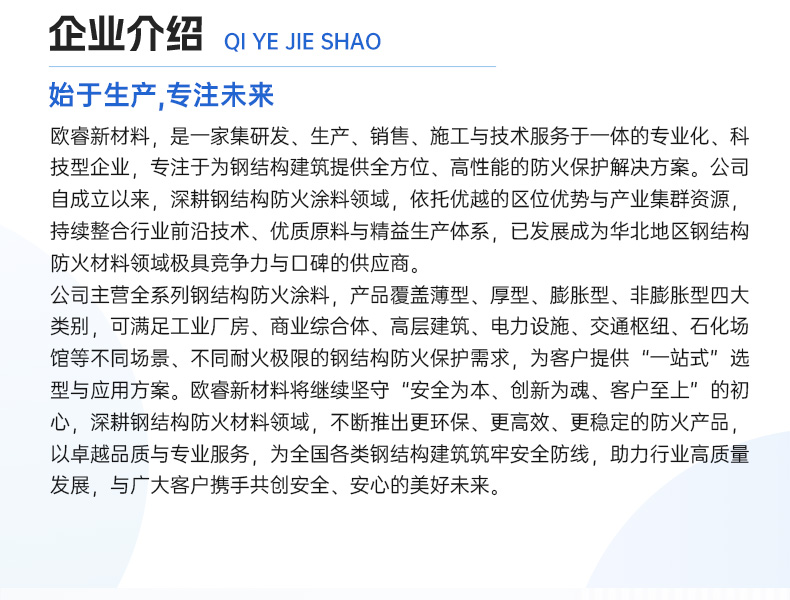主营业务:主营全系列钢结构防火涂料,产品覆盖薄型、厚型、…